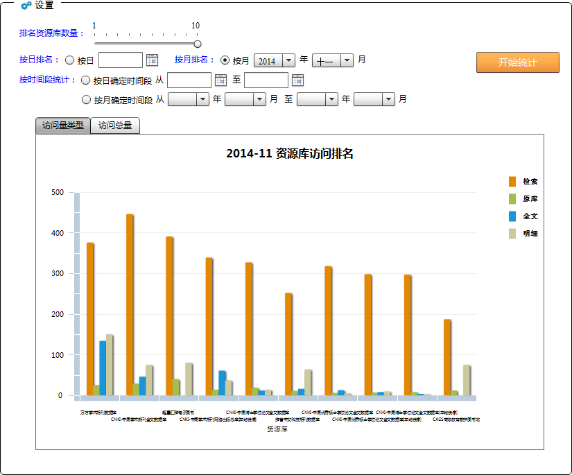點(diǎn)擊菜單【統計與分析>>訪(fǎng)問(wèn)量排行統計>>前十以?xún)扰判袌D】,打開(kāi)前十以?xún)扰判袌D的設置頁(yè)面。這里的時(shí)間范圍設置與總排行表相同,可以具體到某一天,可以是某一個(gè)月,即按日排名和按月排名。支持按時(shí)間段統計排名,可以按日確定時(shí)間段,也可以按月確定時(shí)間段。按日確定時(shí)間段滿(mǎn)足了各種不是整月整年的時(shí)間范圍統計,而按月確定時(shí)間段能滿(mǎn)足整月、半年、一年,或者是幾年的統計時(shí)間范圍的需求。另外增加了資源庫數量的設置,可選擇10以?xún)鹊臄盗?,完成TOP-N的統計圖。