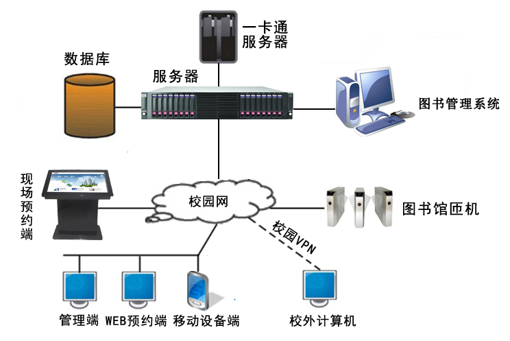 服務(wù)器:服務(wù)器是座位管理系統的核心信息交互及數據處理平臺,負責與校園一卡通進(jìn)行讀者用戶(hù)信息的交互、與圖書(shū)館管理系統進(jìn)行讀者身份以及讀者口令的認證、對座位資源的日常管理、匯總讀者座位資源的使用數據及進(jìn)行報表分析。