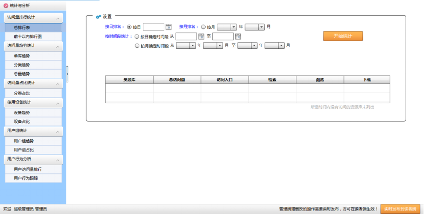 點(diǎn)擊菜單【統計與分析>>用戶(hù)行為分析>>用戶(hù)訪(fǎng)問(wèn)量排行】,打開(kāi)用戶(hù)訪(fǎng)問(wèn)量排行表的設置頁(yè)面。用戶(hù)訪(fǎng)問(wèn)量排行可以詳細了解每一位用戶(hù)的總訪(fǎng)問(wèn)量,并且可以了解其檢索和下載等行為的次數。查看排行時(shí),選擇相應的時(shí)間段即可統計(如下圖)。